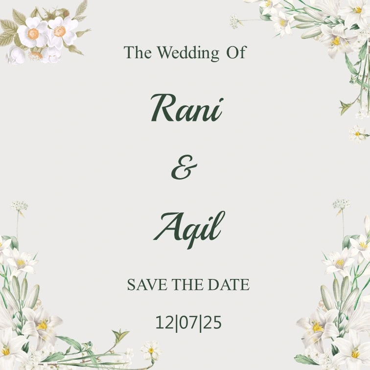 The Wedding Of Trian & Maya 04.05.06 Juli 2025 “Dan segala sesuatu Kami ciptakan berpasang-pasangan agar kamu mengingat (kebesaran Allah).” QS. Az-Zariyat: 49 Save The Date 00Hari 00Jam 00Menit 00Detik Save The Date Two Become One Assalamu’alaikum Wr. Wb. Dengan memohon Rahmat dan Ridho Allah SWT, kami bermaksud untuk mengundang Bapak/Ibu, Saudara/i untuk menghadiri acara […]